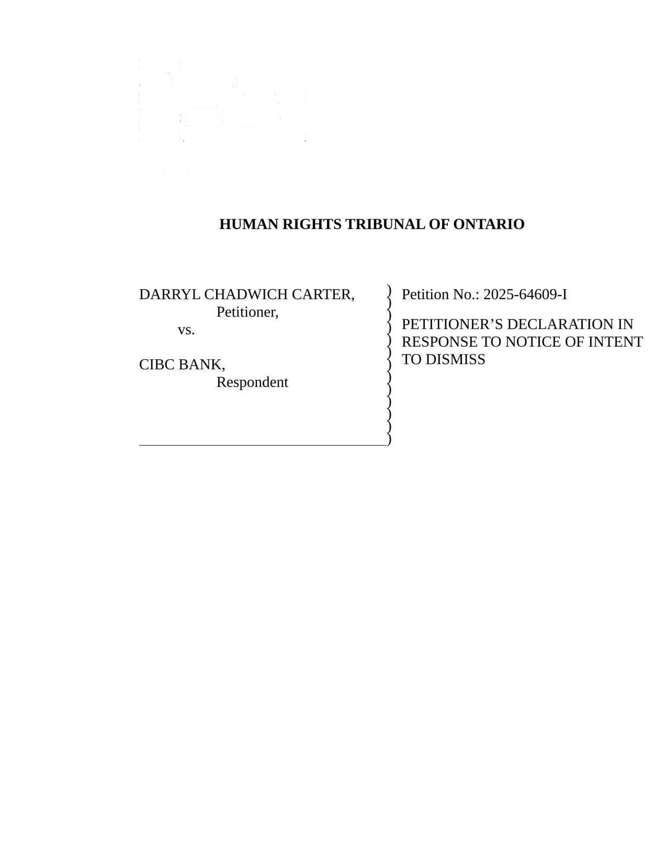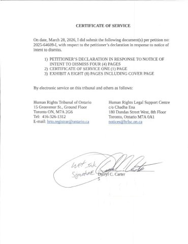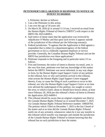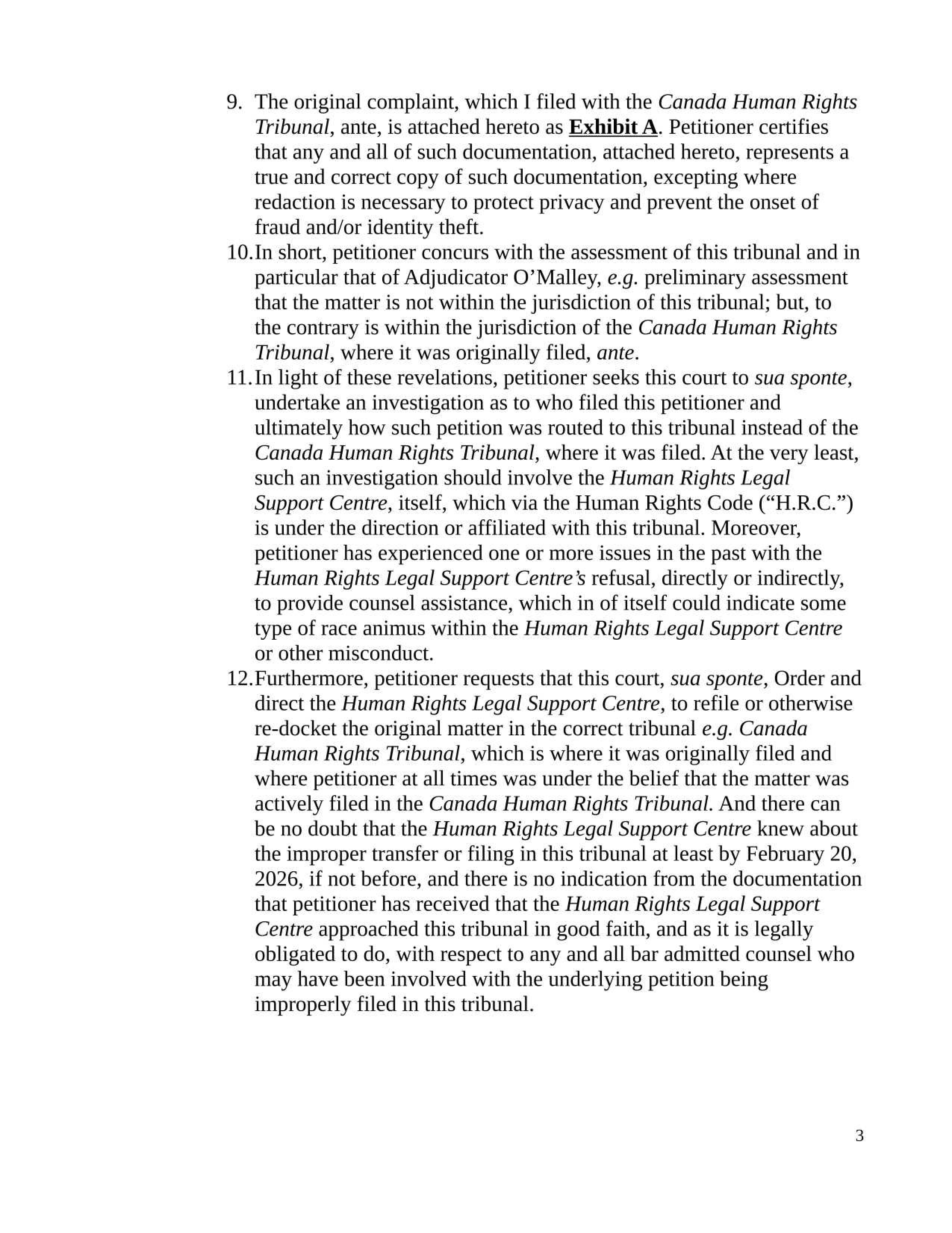 Here is the summary: This case in the Human Rights Tribunal of Ontario was routed over to the Adjudicator O'Malley in that tribunal. Now, first things first, the petitioner never filed the case in the Human Rights Tribunal of Ontario, since the respondent is a federal entity in the Canada. In fact, the matter was originally filed more than four (4) months prior in with the Canada Human Rights Commission. No one knows who filed the document or so they say. A request was returned to Adjudicator O'Malley to investigate who actually filed the document and what role the Human Rights Legal Support Centre had in the matter, if any, since it was named as a representative in the original petition filed with the Canada Human Rights Commission.